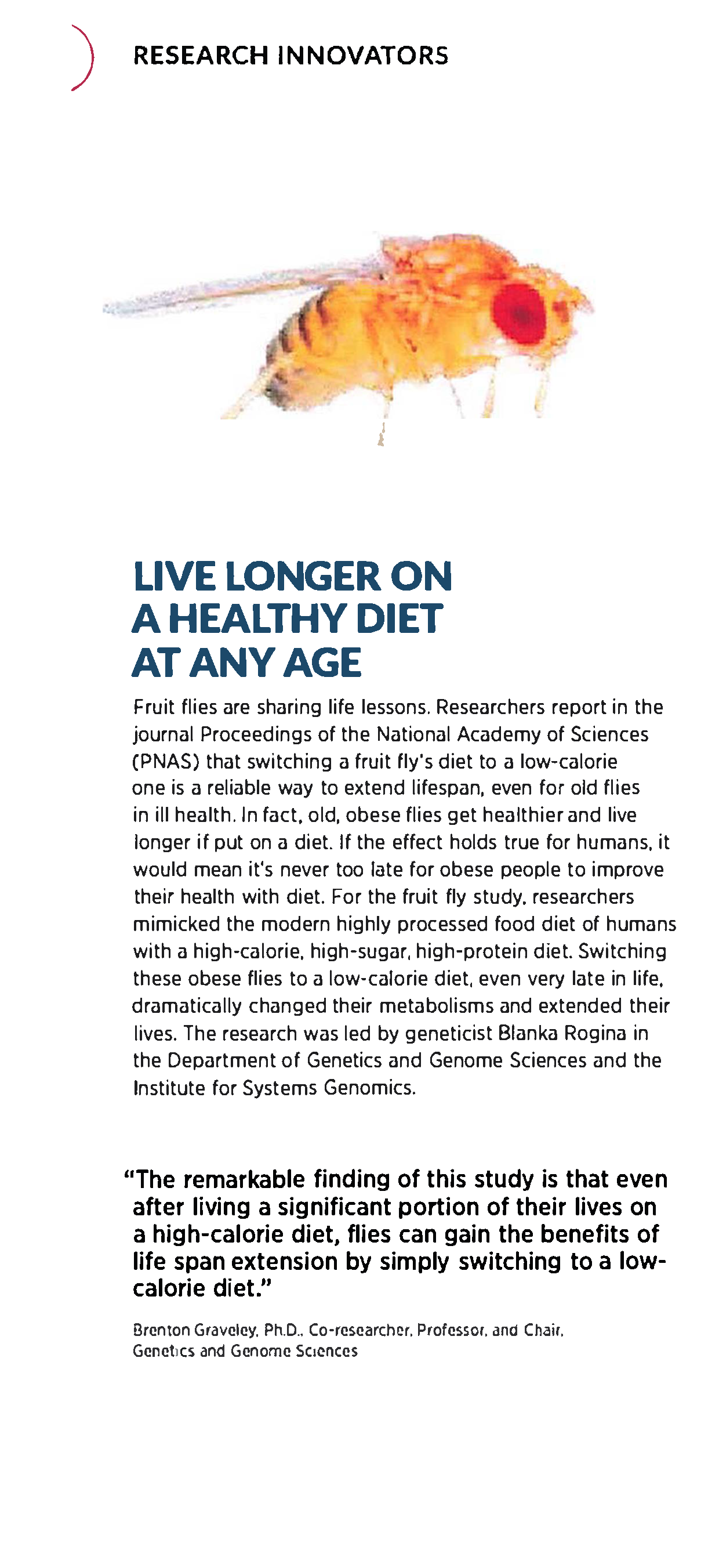 "The remarkable finding of this study is that even after living a significant portion of their lives on a high-calorie diet, flies can gain the benefits of life span extension by simply switching to a low-calorie diet." Commented by Brenton Gravelcy, Ph.D., Co-rescarcher, Professor, and Chair, Genetics and Genome Sciences