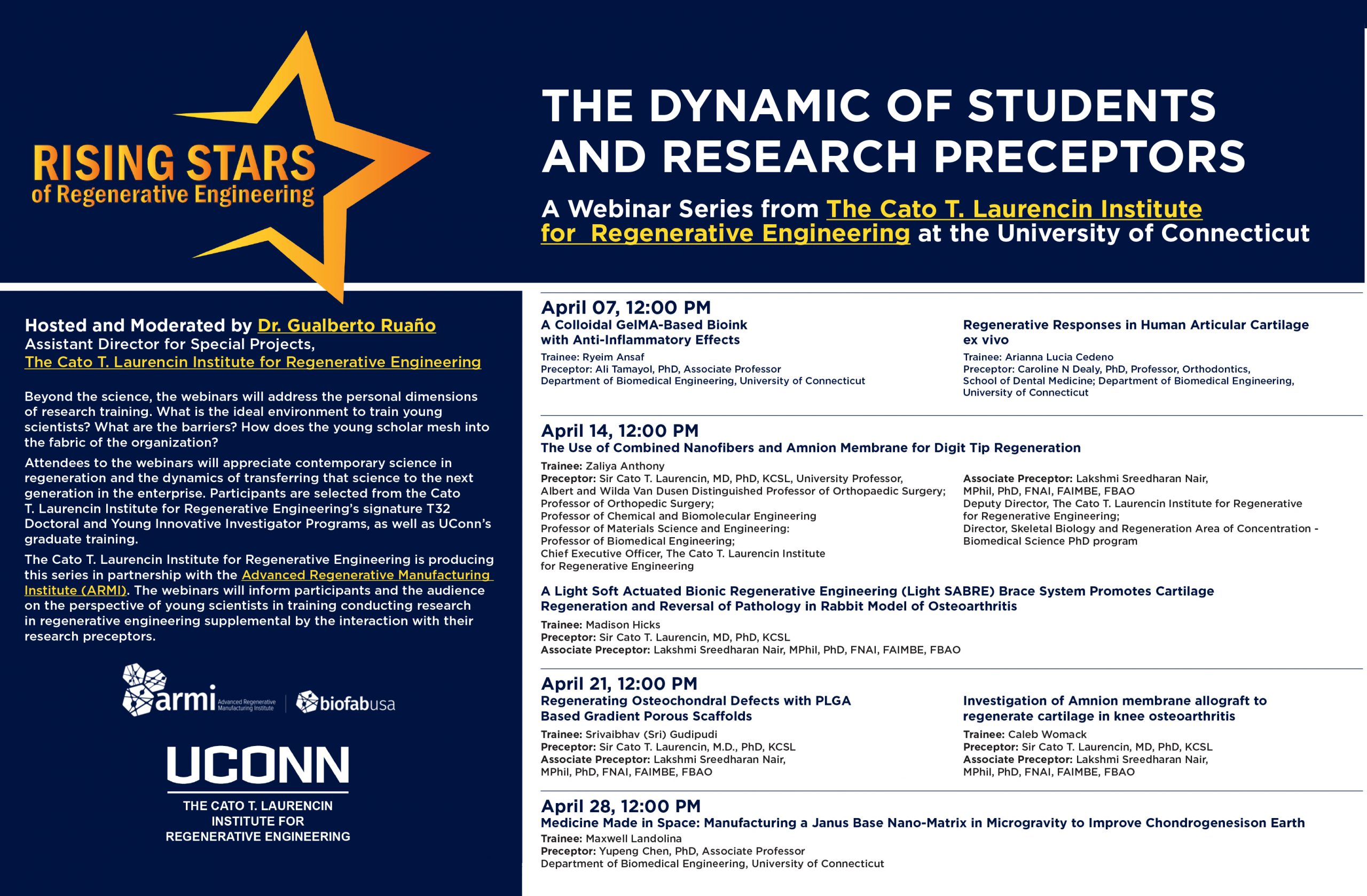 The Cato T. Laurencin Institute for Regenerative Engineering is producing this series in partnership with the Advanced Regenerative Manufacturing Institute (ARMI). The webinars will inform participants and the audience on the perspective of young scientists in training conducting research in regenerative engineering supplemental by the interaction with their research preceptors.